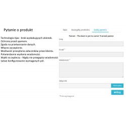 The Ask About Product module for PrestaShop 1.6 and 1.7 - 8.x is a modern Ajax form on the product card. It has a number of anti-spam features. Its particular advantage is that it saves messages to the store's database (messages are available in the customer service tab) and is fully compatible with mobile devices. The ability to set required fields easily adapts to any store profile. An advanced data control system allows you to use the module without the need for CAPTCHA security measures. Additionally, it allows customers to send attachments to store support. A custom hook also allows you to replace the default contact form.